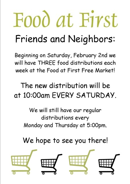 January 23, 2013November 11, 2019 Food At First A New Free Market Distribution Day Added 2013! Share this: Click to share on Facebook (Opens in new window) Facebook Click to share on X (Opens in new window) X Like Loading... Related