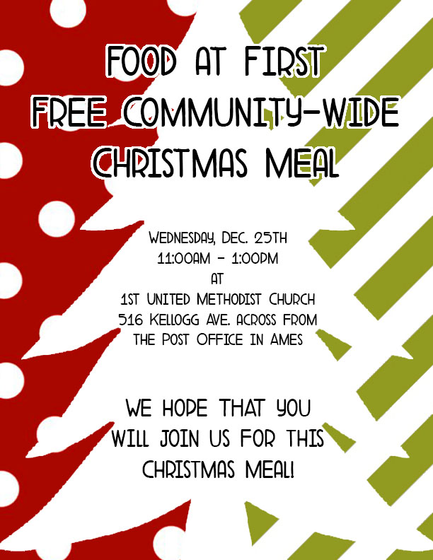 VOLUNTEER at Food at First Christmas 2013 – The Christmas Day Meal tradition continues at Food at First! This years meal will be on Christmas day Wed Dec 25, 2013 at Ames First United Methodist Church, 516 Kellogg. All are welcome to come and share in a free and fantastic community-wide Christmas dinner! Sign-up to volunteer at the 2013 Christmas meal, prepare the meal, serve or cleanup. We still have openings, but they go FAST.