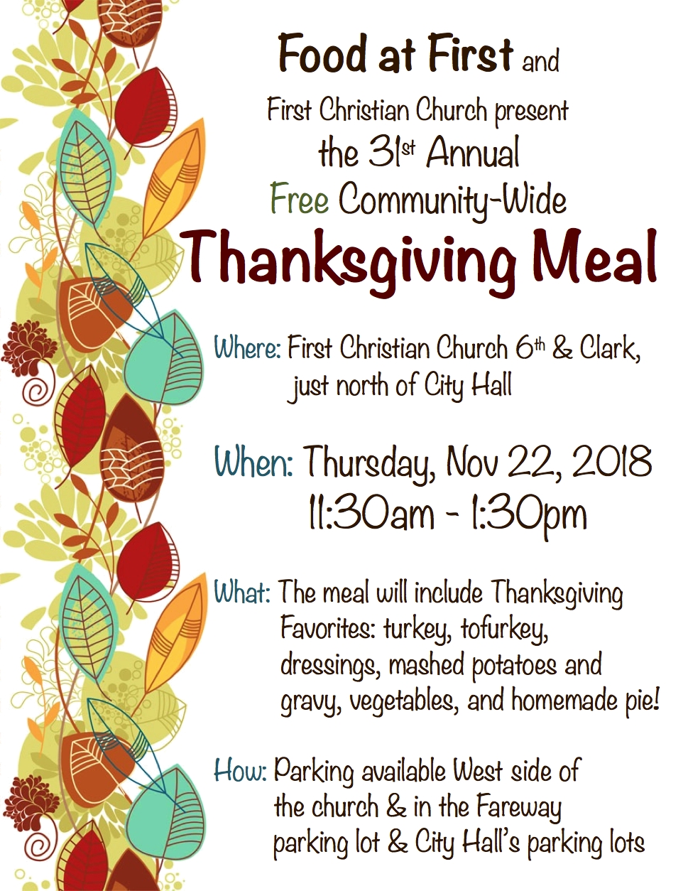 31st Annual Community-Wide Thanksgiving meal was Thursday Nov 22 2018 – Food at First is continuing this tradition of hosting the annual Community-wide Free Thanksgiving Day meal. 2018 marks the 31st year for the feast in Ames, which is free to anyone who would like to dine from 11:30 AM until 1:30 PM in the lower level of the church, located at 611 Clark Avenue.