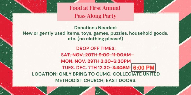 Please think about what you have in your home, gently used or new that you no longer need and is taking up space. Toys, games, puzzles, household goods and drop off to CUMC Collegiate United Methodist Church, EAST doors. Thank you so much.