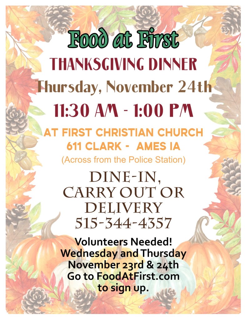 Location: 611 Clark, First Christian Church, Ames, IA (across from Ames Police Station). Dine-in or Carry-out or delivery.