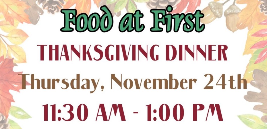 Food at First is back serving meals inside. Thanksgiving 2022 you have choices: dine in, carry out or delivery. Food at First is Thankful for its many volunteers today and every day, the many donations and gifts, the thousands of hours of dedicated volunteers, every day, all year, and all the people that Food at First is able to help make life a brighter safer place. So much to be grateful for!