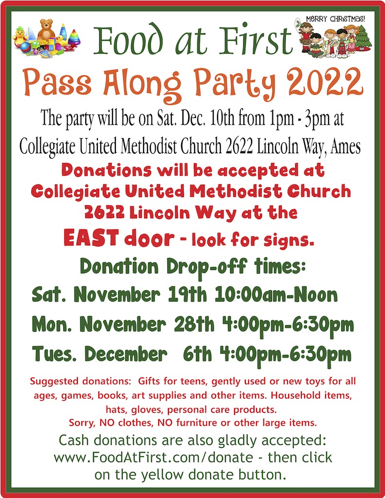 Gift Ideas – Please donate items for the “Pass Along Party”. Especially children’s gifts, gently used or new toys for all ages, games, children’s books, dolls, toy trucks or other items. Please consider donating something YOU or your children love to receive for a gift? Sorry, no clothes, no furniture or large items.