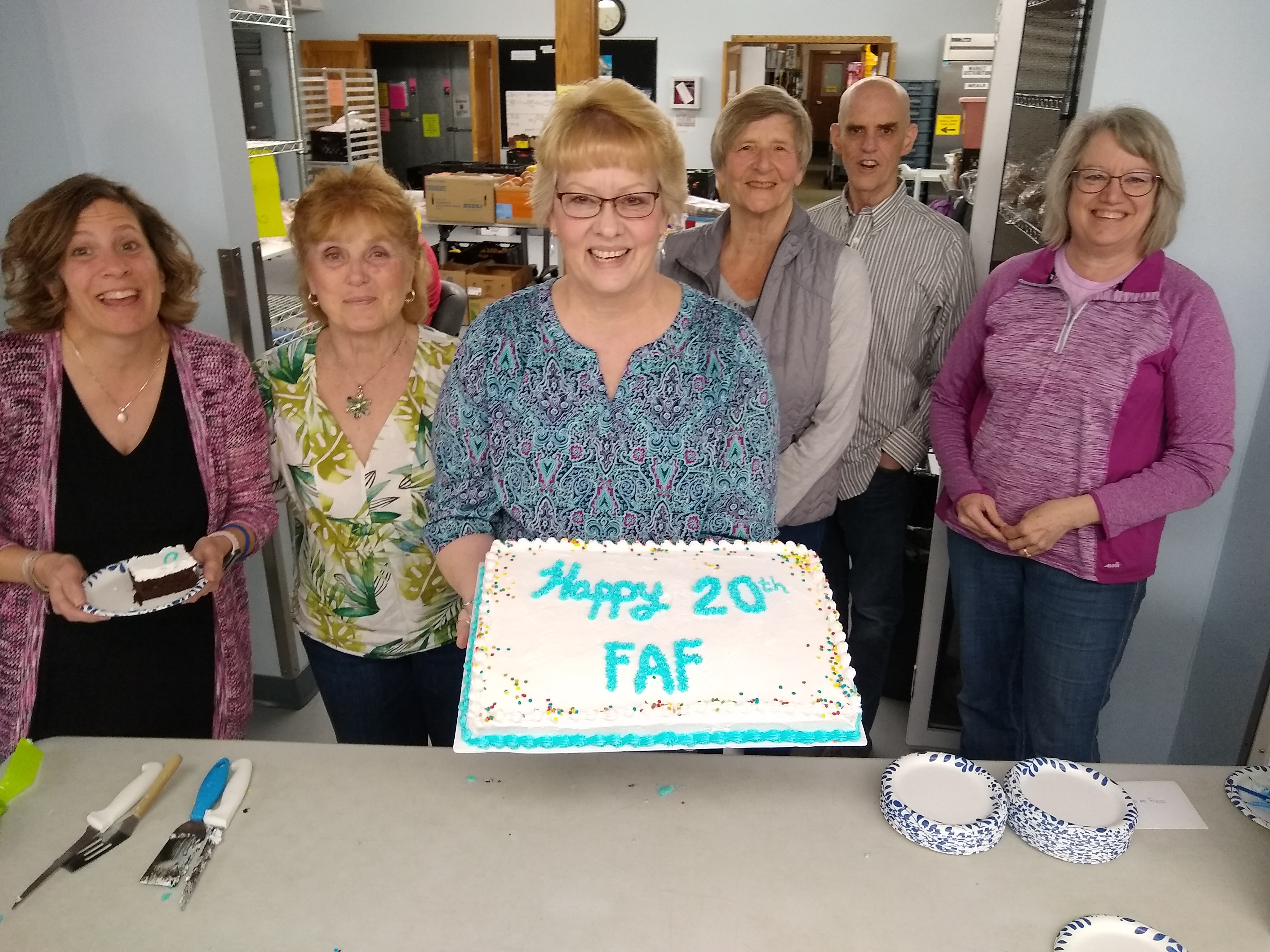 Friday, April 7, 2023 at 6:15 pm, Food At First, FAF, celebrated its 20th Birthday! At 611 Clark Avenue, Ames, IA, use the west entrance and help us celebrate as we blow out 20 candles on a very large cake.