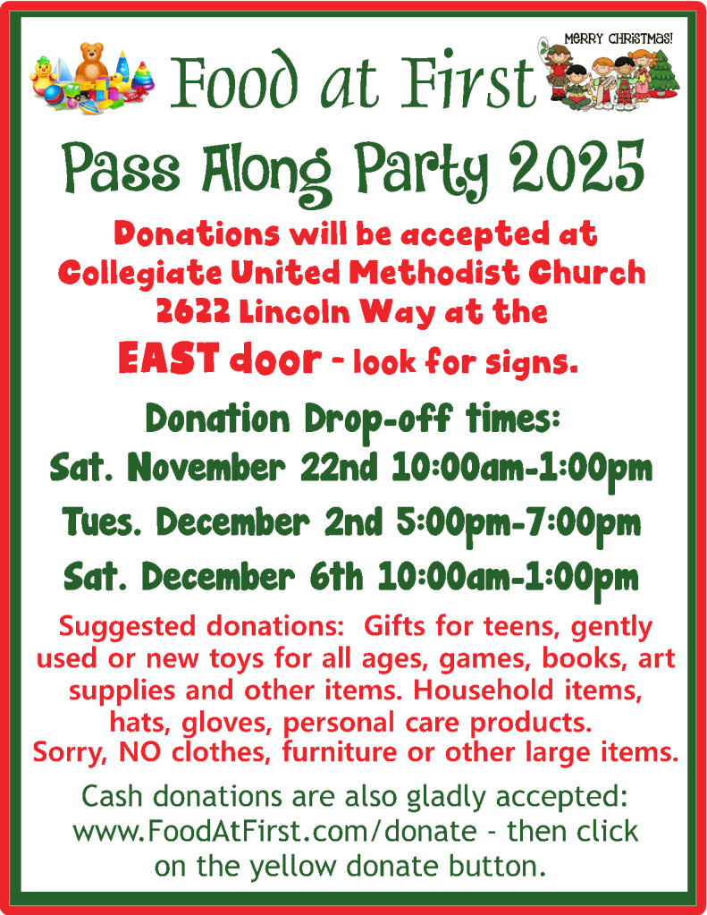 PASS ALONG PARTY 2025 will be sometime in December at Collegiate United Methodist Church, 2622 Lincoln Way in Ames Iowa. The date of the party will be announced a week before the event.