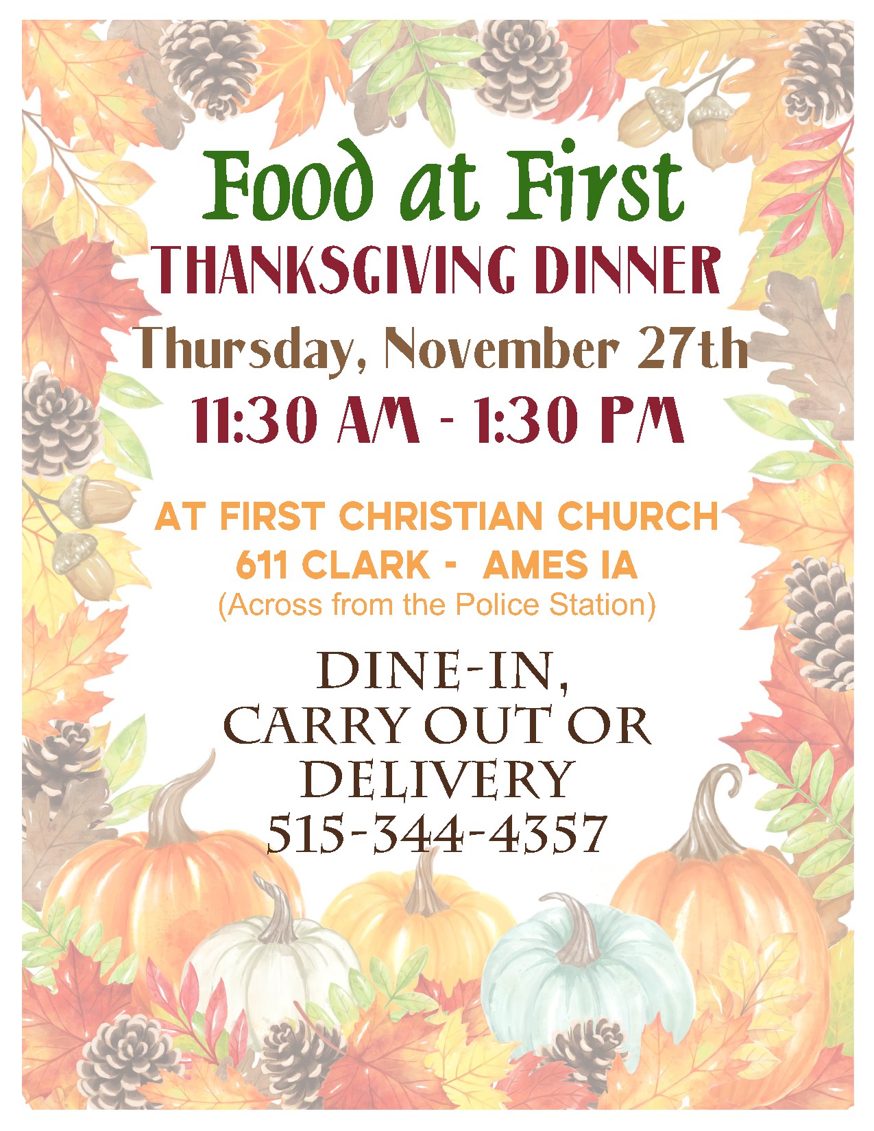 Location: 611 Clark, First Christian Church, Ames, IA (across from Ames Police Station). Dine-in, carry-out or delivery.